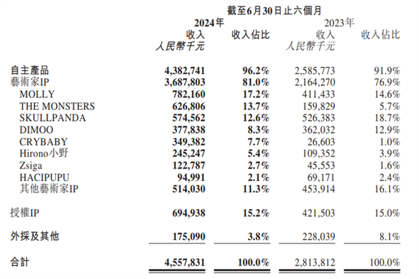 8 月 20 日,泡泡玛特发布 2024 上半年纪迹,收入约 45.58 亿元,同比增长 62 % ;盈利 9.64 亿,同比增长 102 % 。其中, Labubu 所在的 IP 【 THE MONSTERS 】收入仍是靠拢泡泡玛特的老牌 IP MOLLY 。