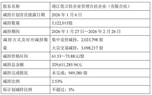 公司于2026年2月26日收到优立佳合资出具的《对于提前休止减握规画暨减握股份成果的奉告函》,优立佳合资于2026年1月27日至2026年2月26日历间整个减握公司股份5,122,015股,占公司总股本的2.53%,并于2026年2月26日提前完资本次减握,本次减握完成后,优立佳合资握有公司股份20,571,132股,占公司总股本的10.16%。本次减握价钱区间61.53至73.88元/股,减握总金额329,611,285.94元。