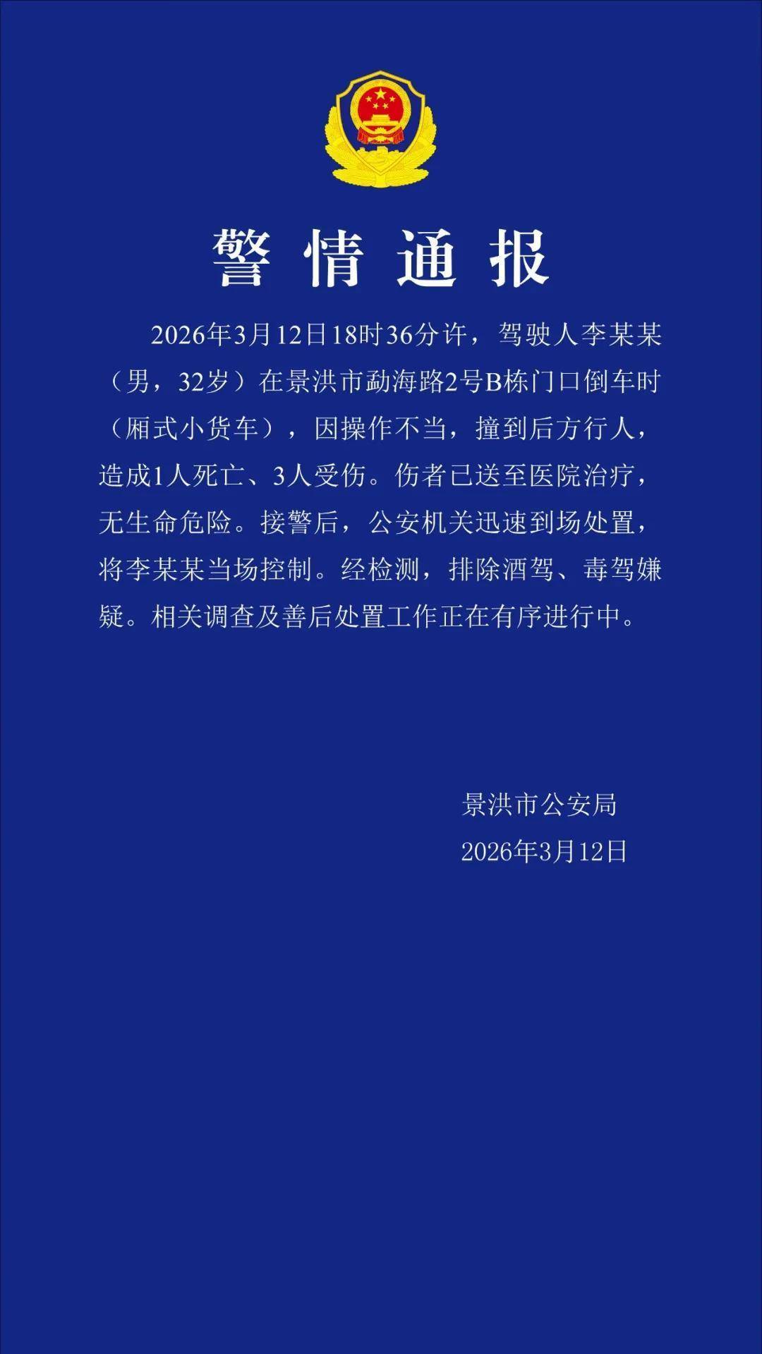 2026年3月12日18时36分许,驾驶东说念主李某某(男,32岁)在景洪市勐海路2号B栋门口倒车时(厢式小货车),因操作不妥,撞到后方行东说念主,变成1东说念主赔本、3东说念主受伤。伤者已送至病院颐养,无生命危机。接警后,公安机关飞速到场贬责,将李某某马上排除。经检测,摒除酒驾、毒驾嫌疑。关连走访及善后贬责使命正在有序进行中。