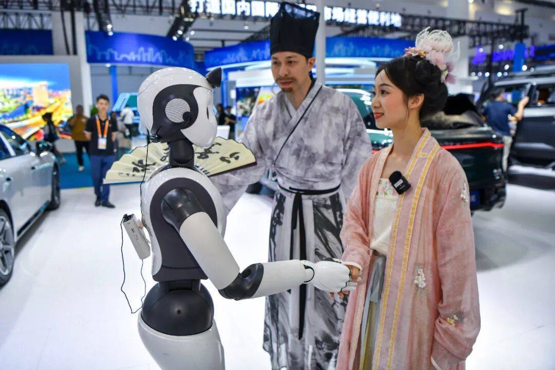 2024年4月15日,海南海口,第四届中国国际破费品展览会上,身着汉服的参不雅者与“柔好意思东谈主形智能职业机器东谈主”互动。中新社记者 骆云飞 摄