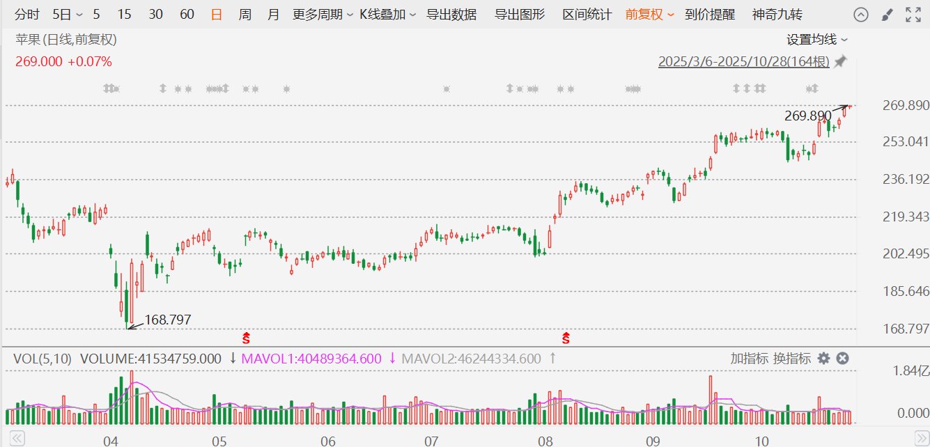 格隆汇10月29日|苹果(AAPL.US)周二盘中一度涨0.4%,报269.89好意思元,再创历史新高,市值首度冲突4万亿好意思元开云体育,成为历史上第三家达到4万亿好意思元里程碑的上市公司。